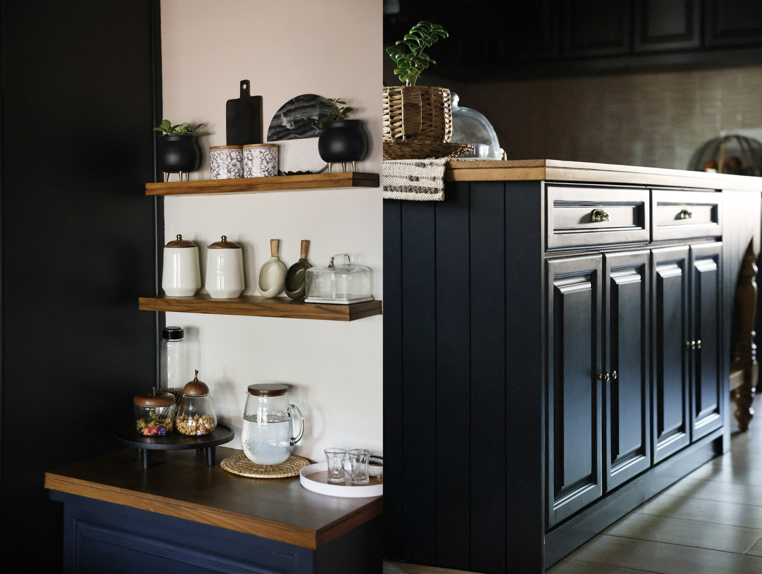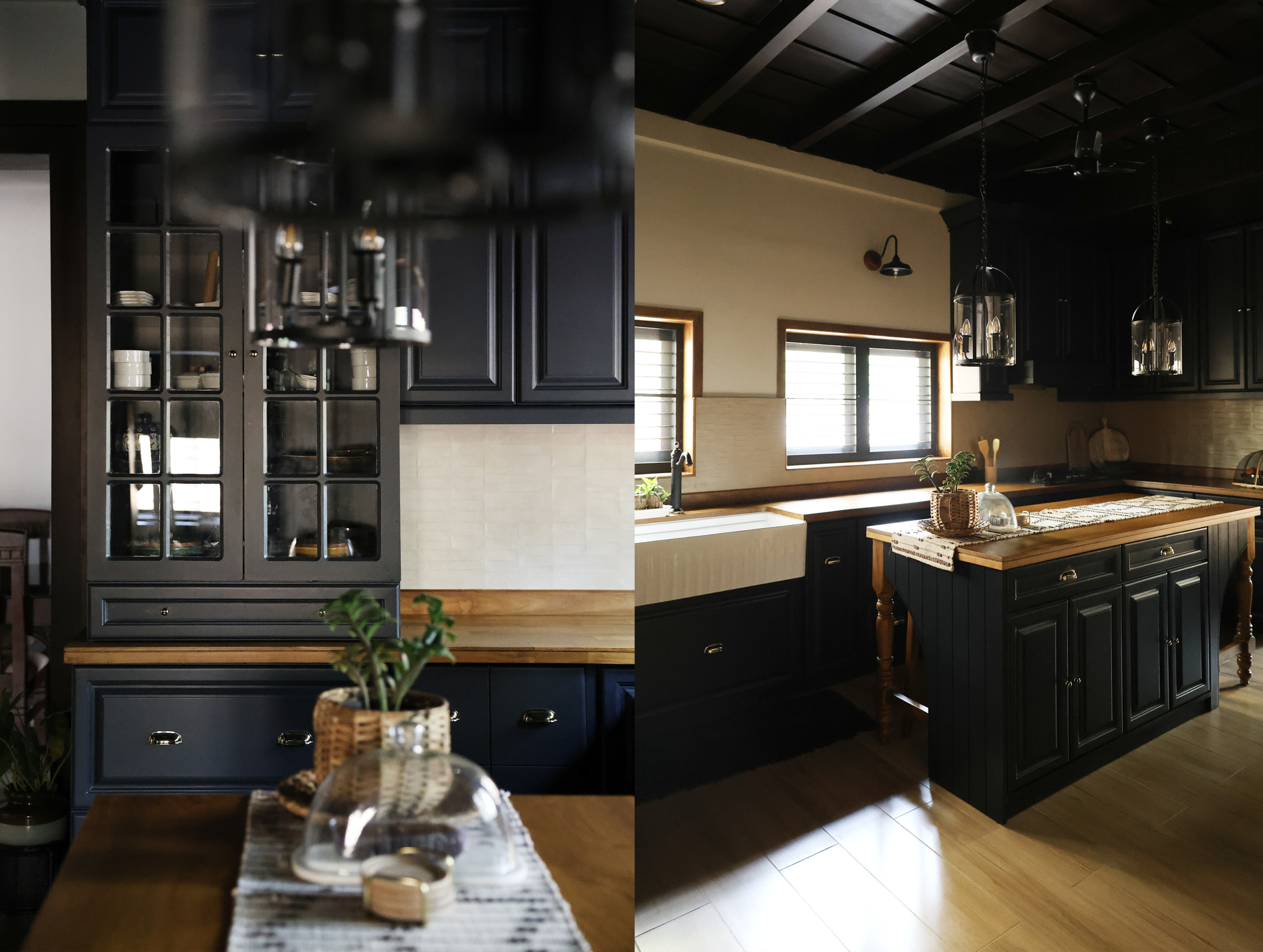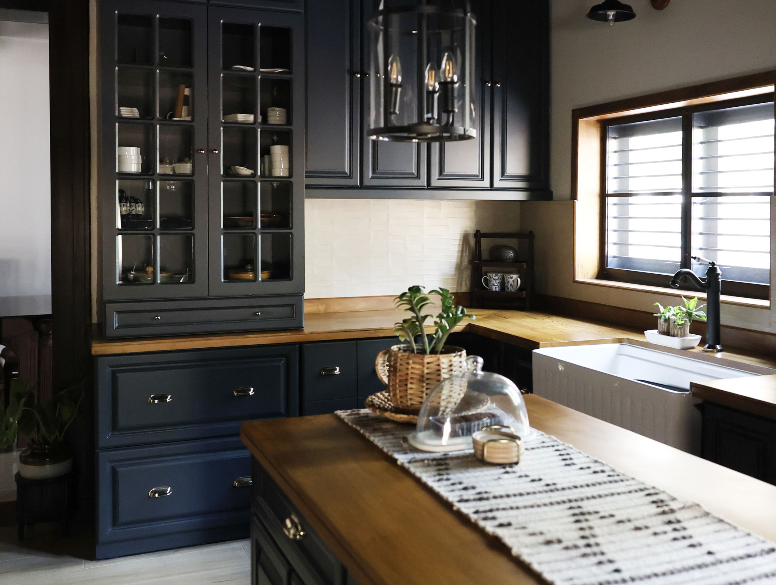 A modern classic kitchen makeover blending deep tones, warm wood, and timeless detailing.