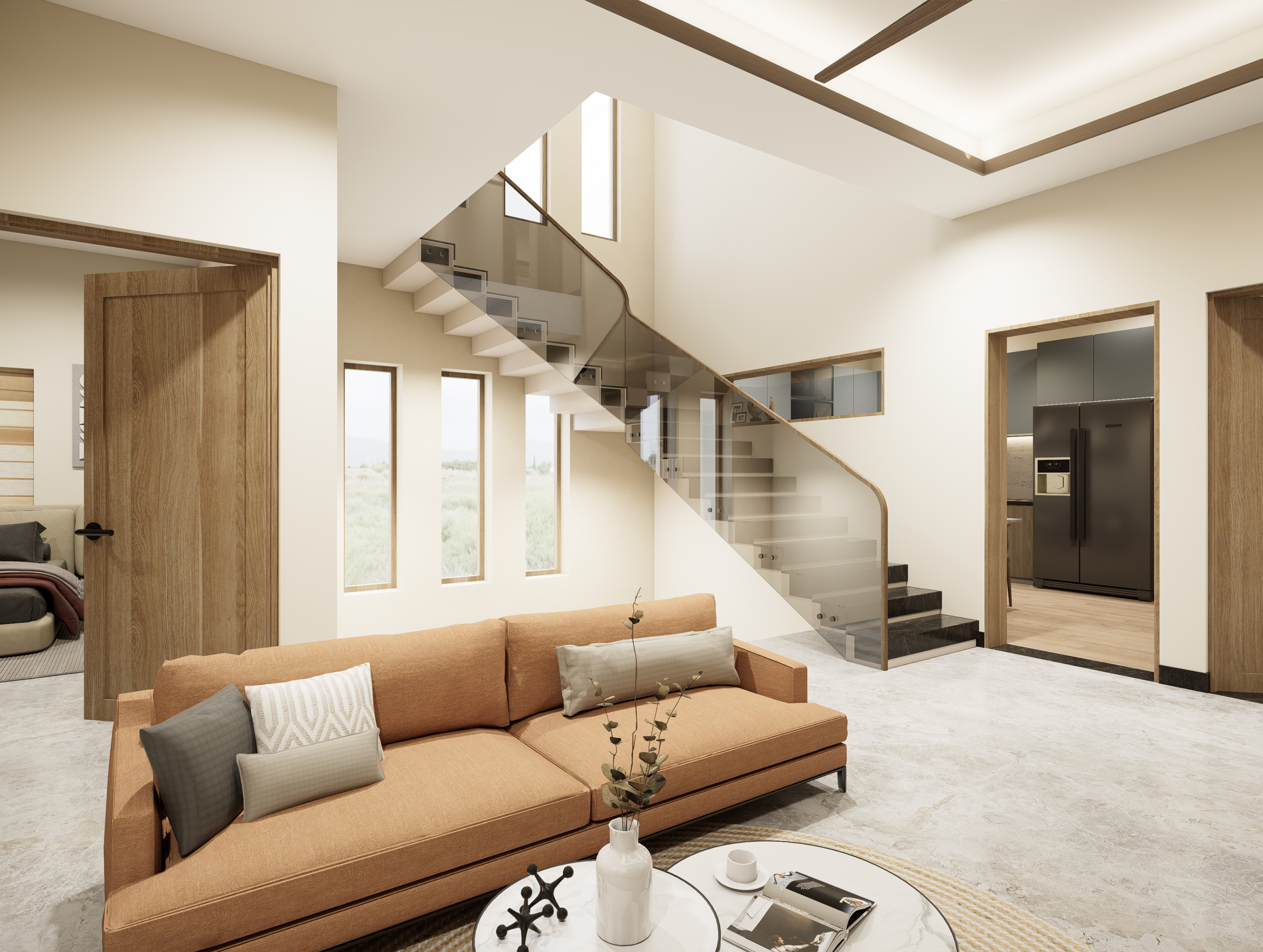 A restrained palette defines the design, where textured neutrals are paired with natural wood cladding to introduce warmth. Large glass openings allow daylight to flood the interiors, while muted tones of beige, white, and stone grey highlight the structure’s modernist character. The material expression is both durable and refined, ensuring that the villa ages gracefully while maintaining a timeless appeal.