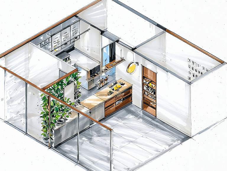 Biophilia is embedded not as an ornamental element but as an architectural device. Green walls frame the service counter, softening the orthogonal lines and mediating between interior and exterior thresholds. The signage and brand integration are deliberately subtle, allowing the café to harmonise with the natural light and landscaped edges of the site.