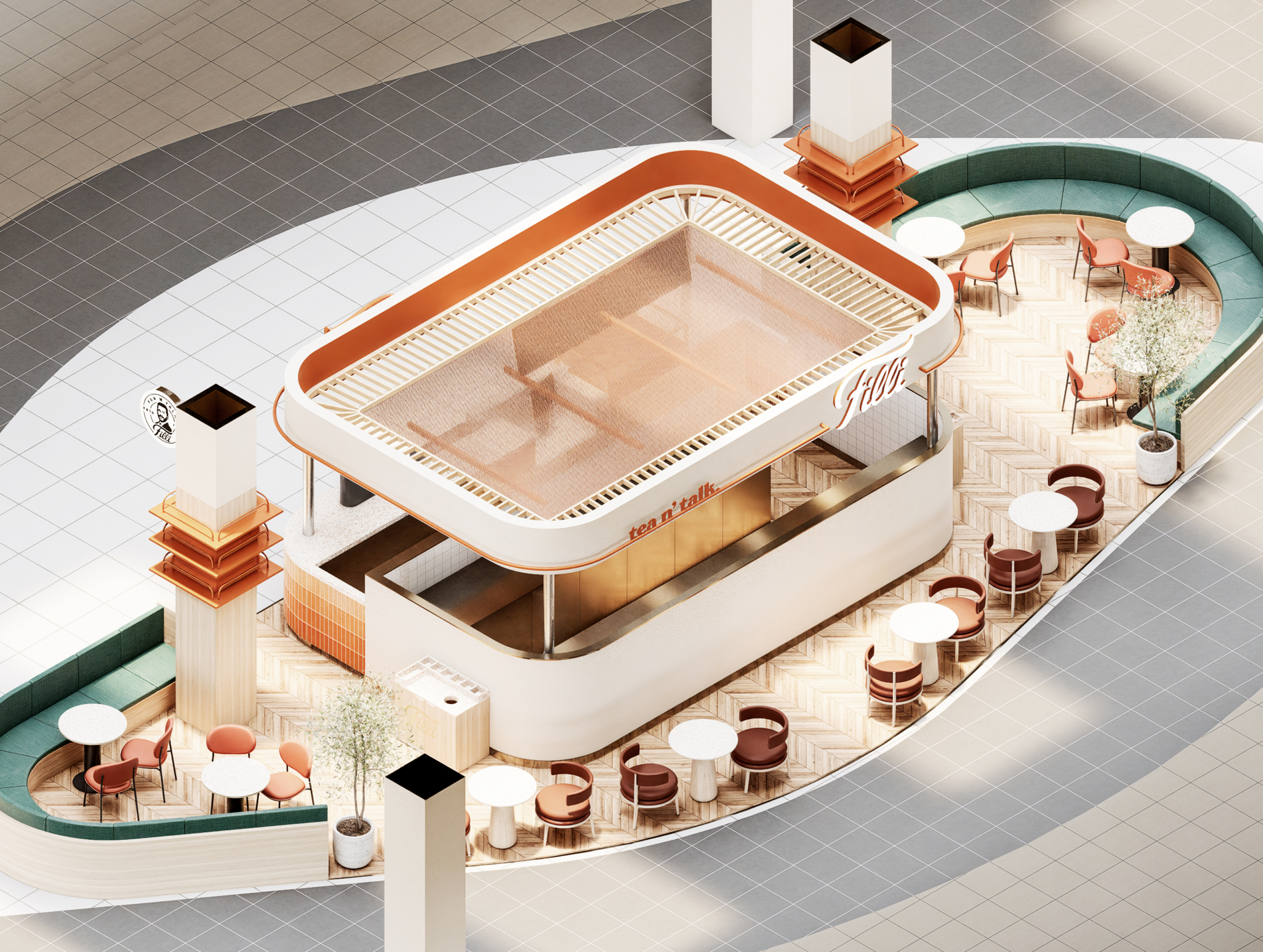 A kiosk café concept defined by warm terracotta textures, terrazzo detailing, and fluid seating zones.