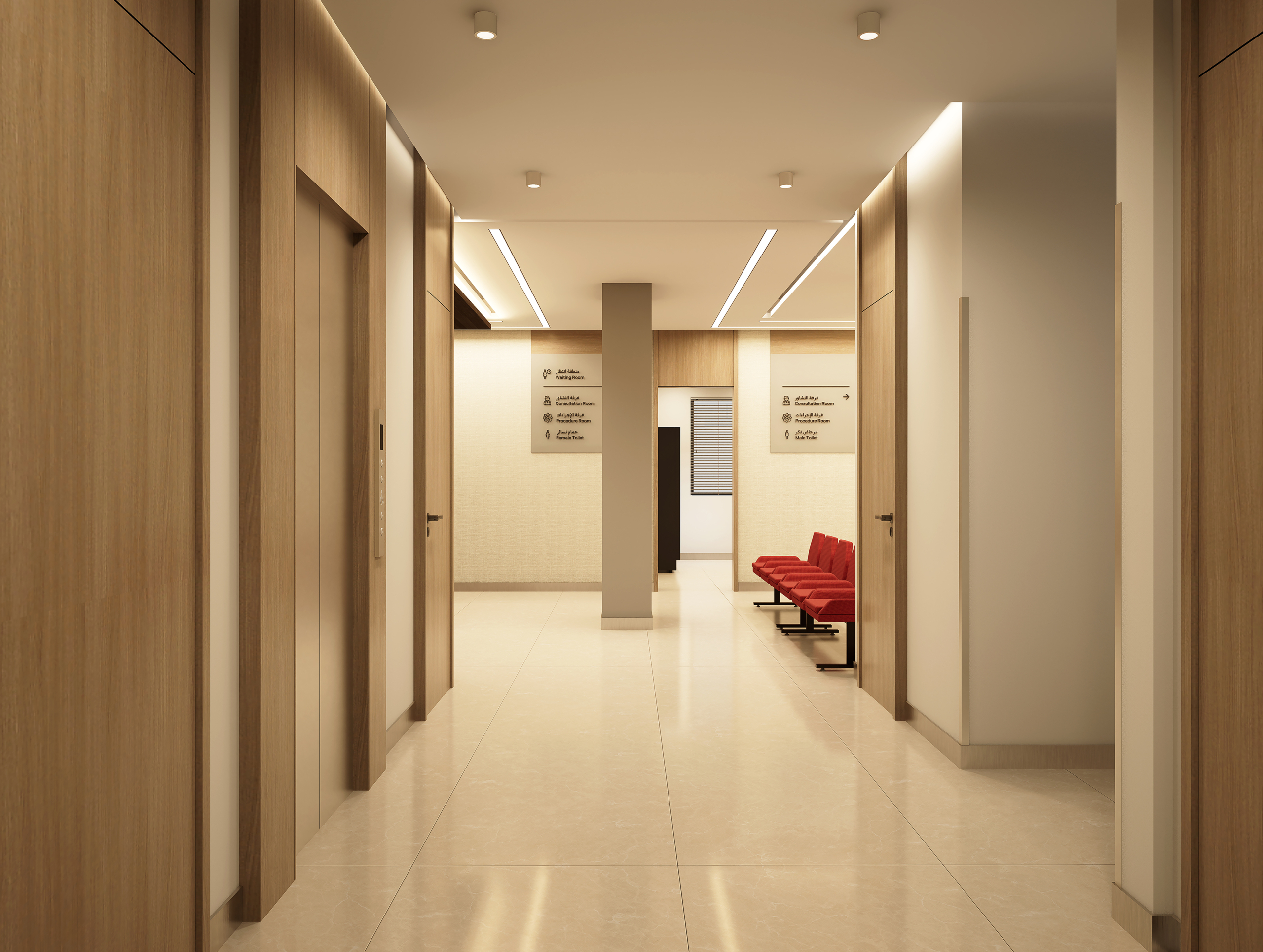 KIMS Health Wakra Dermatology and Cosmetology Department was designed by Mashal Architects under the direction of Ar. Ahmed Mashal to combine medical precision with patient-centered comfort. Neutral tones, warm accents, and thoughtful planning deliver a professional, calming environment that supports both staff efficiency and patient wellbeing.