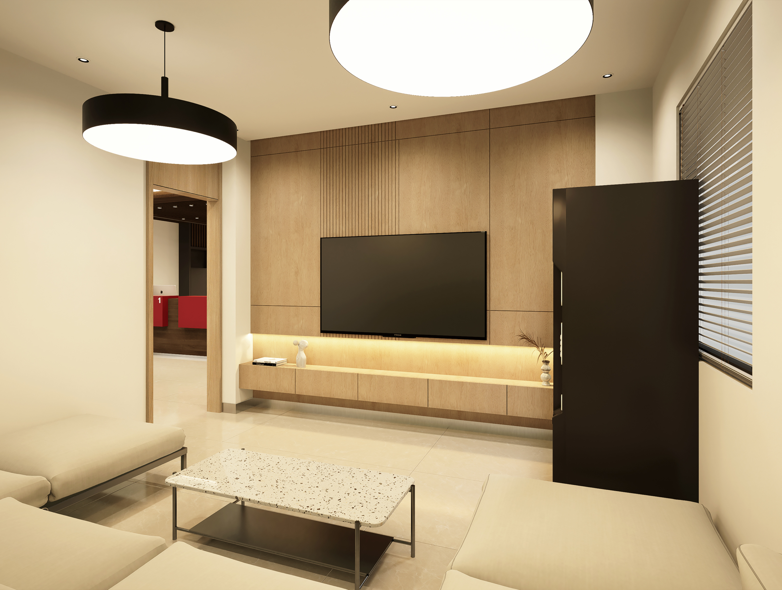 The interiors employ a palette of soft neutrals paired with warm wood finishes and clean white surfaces. This combination creates a professional yet soothing environment, helping patients feel at ease. Reception and waiting areas are accented with bold red seating that ties to the KIMS Health brand identity, while consultation and treatment rooms are finished with minimalist detailing for clarity and functionality.