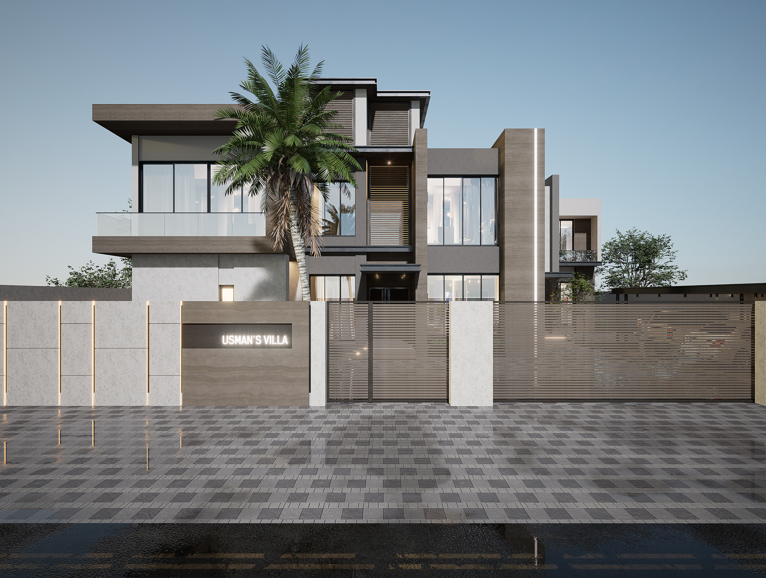 This villa in Nad Al Sheba, Dubai, was conceived as a bold contemporary residence that balances strong geometric volumes with refined materiality. The exterior composition juxtaposes textured concrete, sleek wood cladding, and expansive glazing, creating a striking architectural language. Vertical and horizontal masses intersect cleanly, while integrated lighting details accentuate the sculptural form at night, giving the home a timeless yet modern identity.