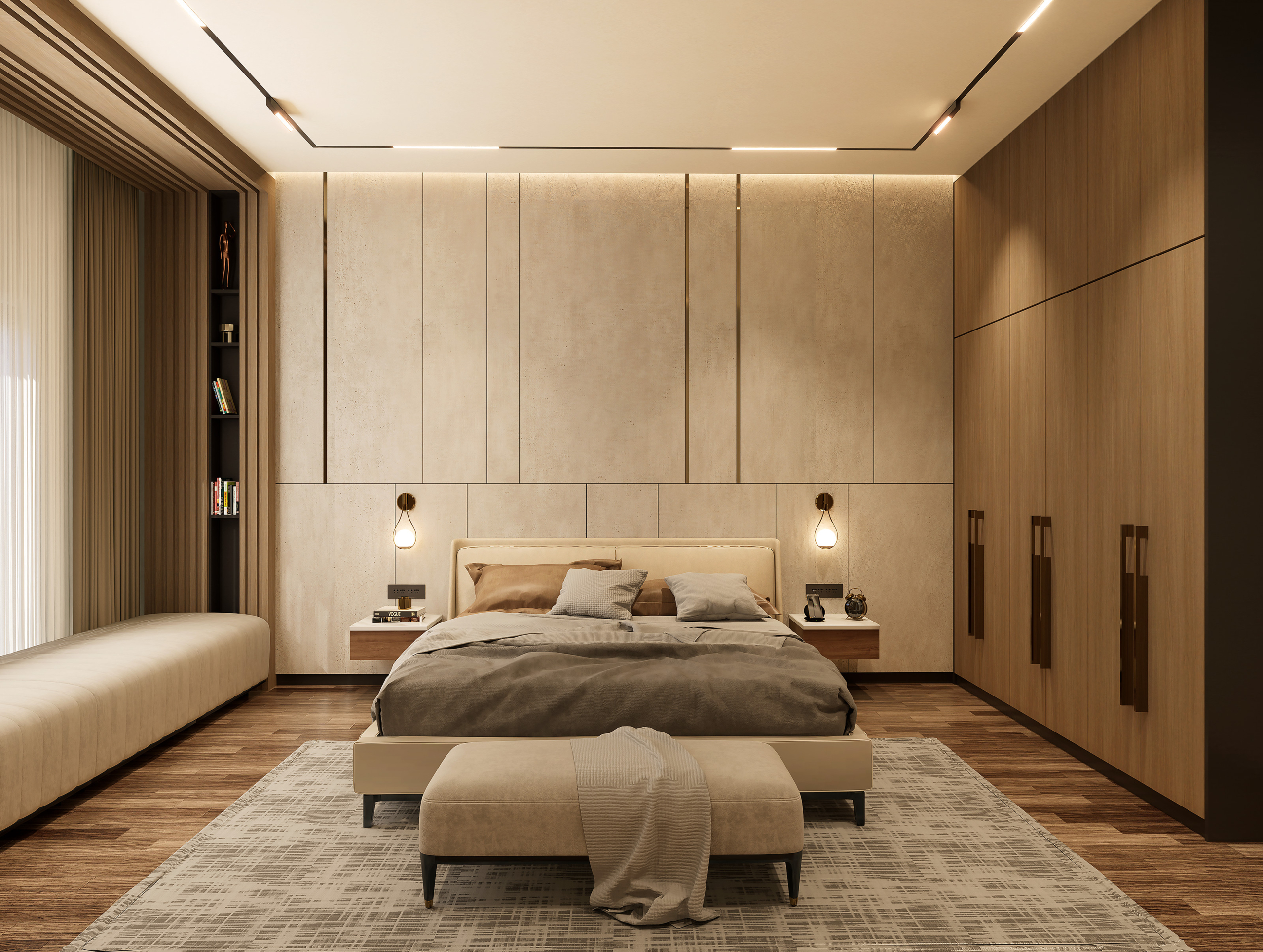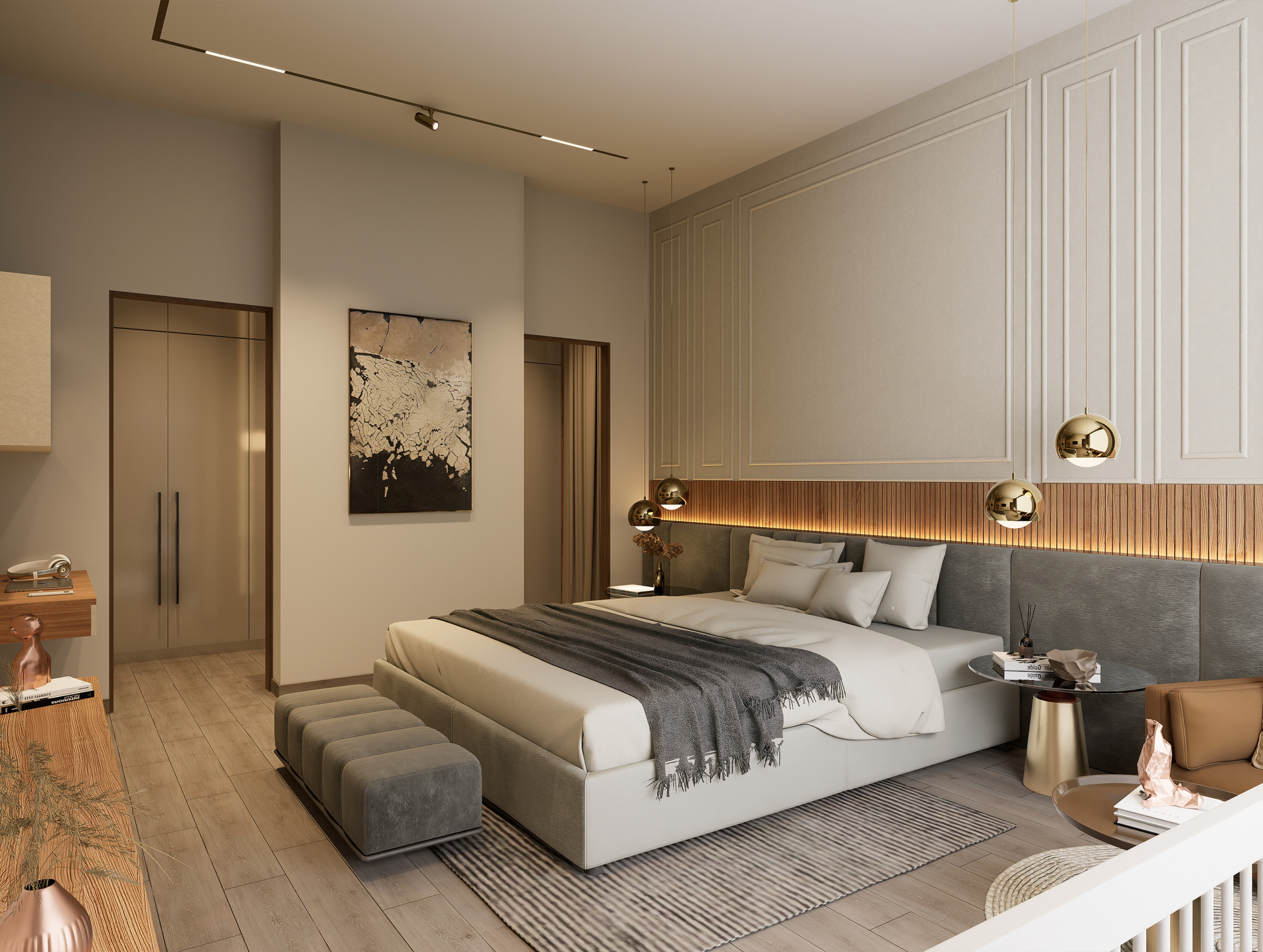 The interiors extend this architectural clarity through a palette of muted neutrals, warm timber, and carefully layered finishes. Spaces were planned to maximize openness and flow, with double-height glazing bringing natural light deep into the core. Custom joinery and bespoke furniture add a tailored dimension, blending luxury with everyday functionality. Each space was designed as part of a cohesive whole, ensuring visual harmony from entrance to private areas.
